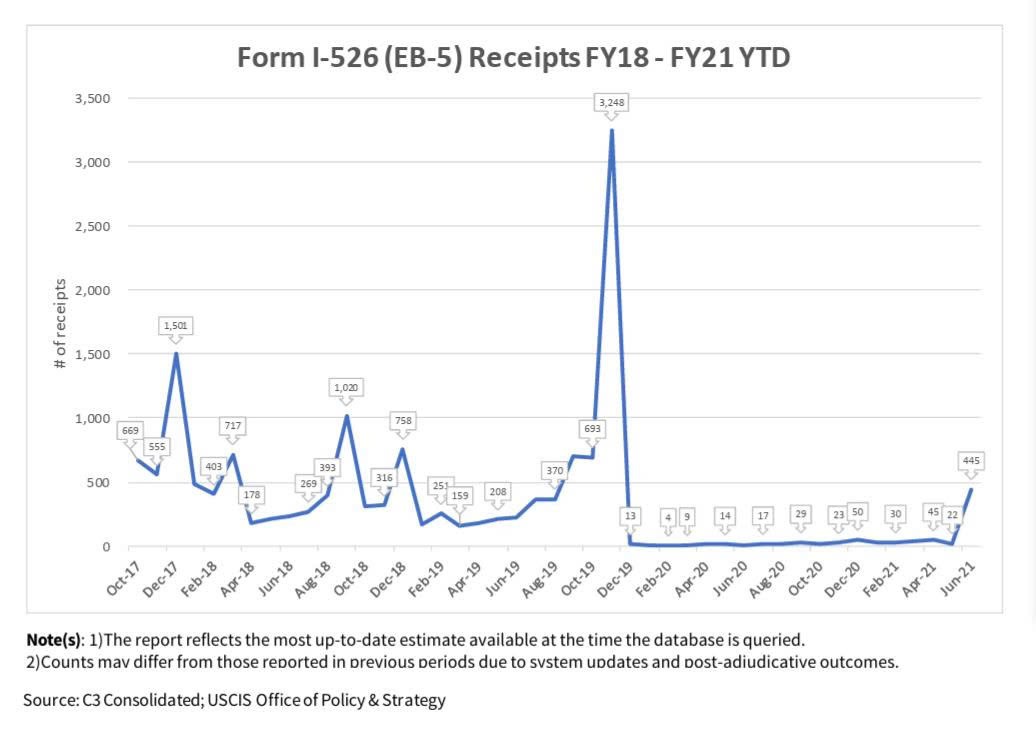 Mới đây, Sở di trú Mỹ (USCIS) có một thống kê cho thấy số lượng hồ sơ Form I-526 được nộp có mức tăng đột biến đáng kể trước khi quy định mới có hiệu lực, sau đó là sự sụt giảm mạnh trong những tháng tiếp theo.